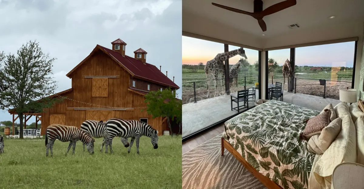 You can wake up in Texas with a giraffe outside your cabin window. At Blue Hills Ranch near Waco, morning does not start with traffic …